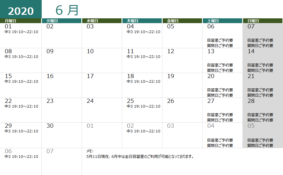2020年6月は、全日自習室(13時~22時の任意の時間)をご利用頂けます。