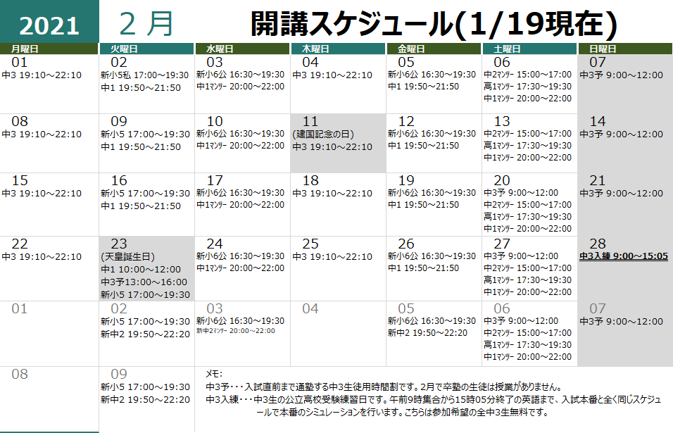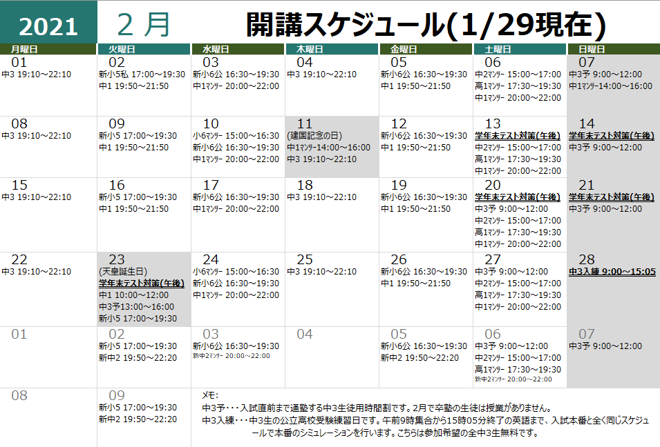 2月は新クラス作成や、曜日変更、学年末対策授業等も入ってきますので、まだまだ大きく変わってくると思いますが宜しくお願い致します。