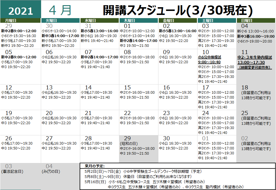 春期講習日程入りの予定表が完成しました。宜しくお願い致します。