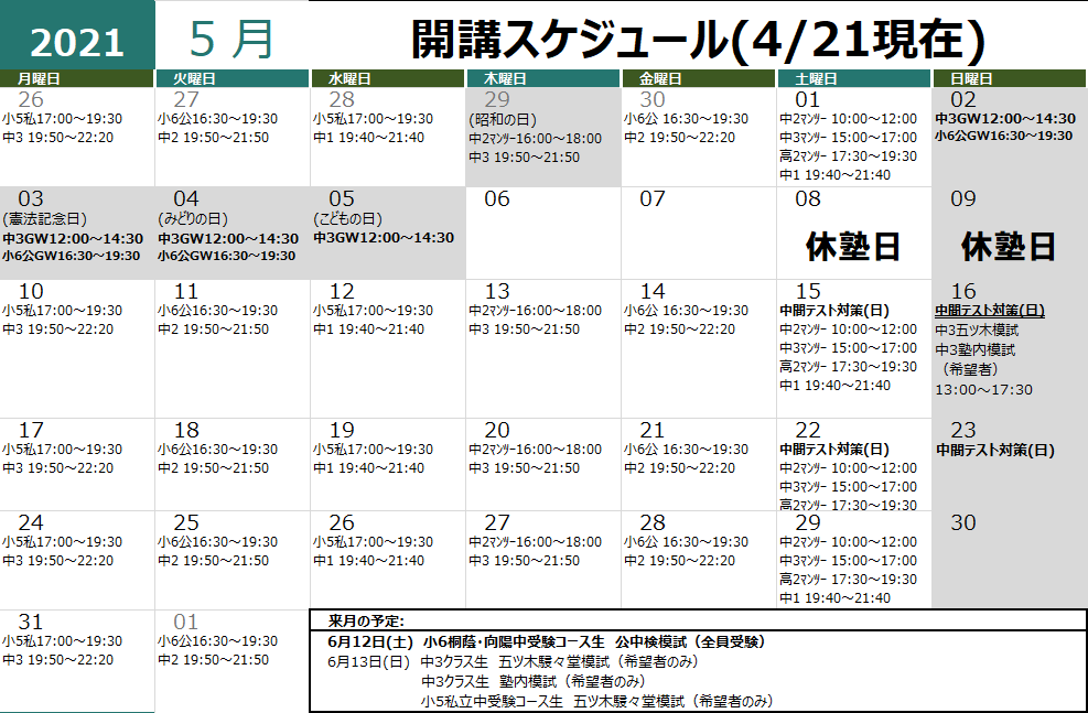 5月の開講スケジュールです。