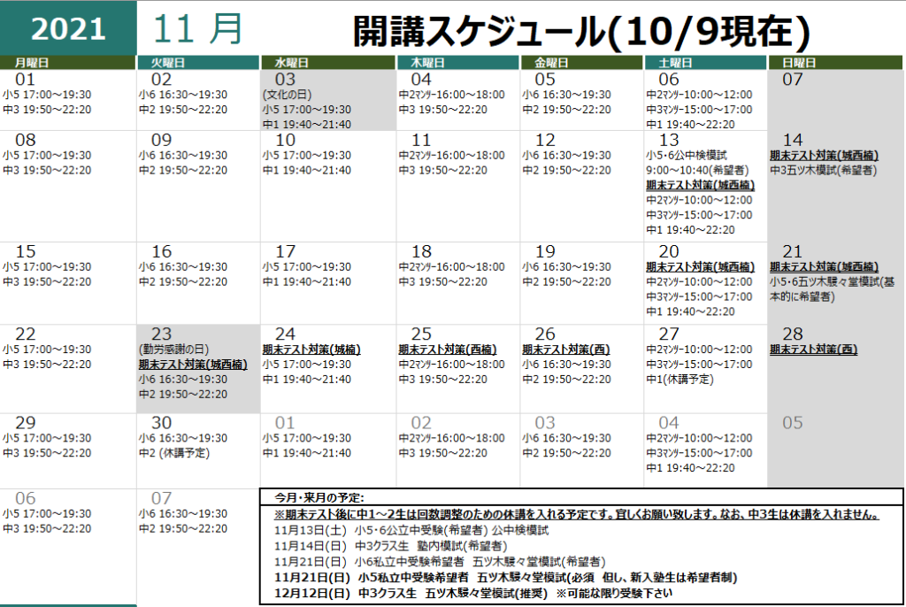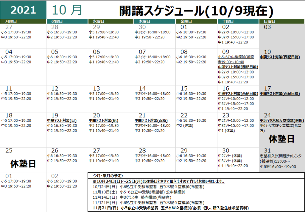 10月24日(日)・25日(月)は休塾日のため、自習室等のご利用も出来ませんのでご注意下さい。また、ご連絡を頂戴した場合、お返事が遅れることがあると思いますが、その点も併せてご了承下さい。宜しくお願い致します。