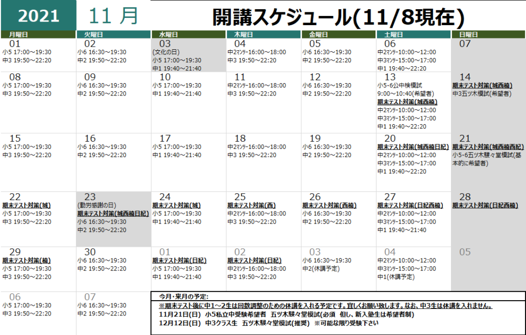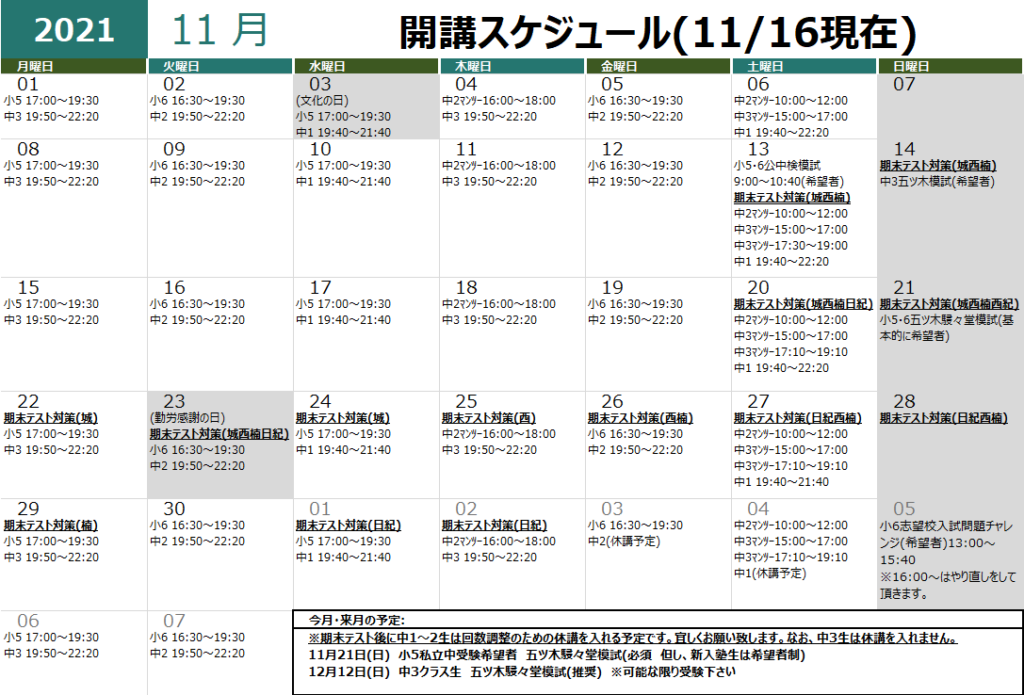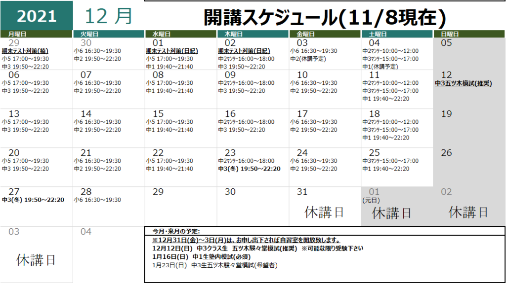 冬期講習は、中3・中1・小6・小5生で行う予定です。中2生は日程を増やさず、冬期テキストをご購入の上、通常授業内で使用し、小テスト不合格者の呼出をさせて頂こうと思います。