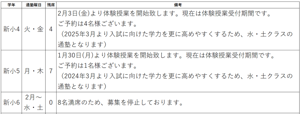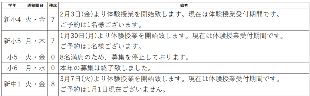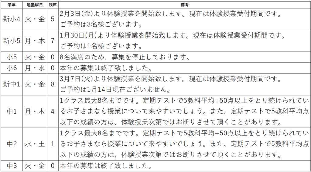新小学4年生および新小学5年生を、昨年12月8日から募集開始しております。