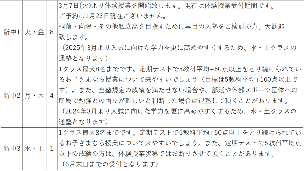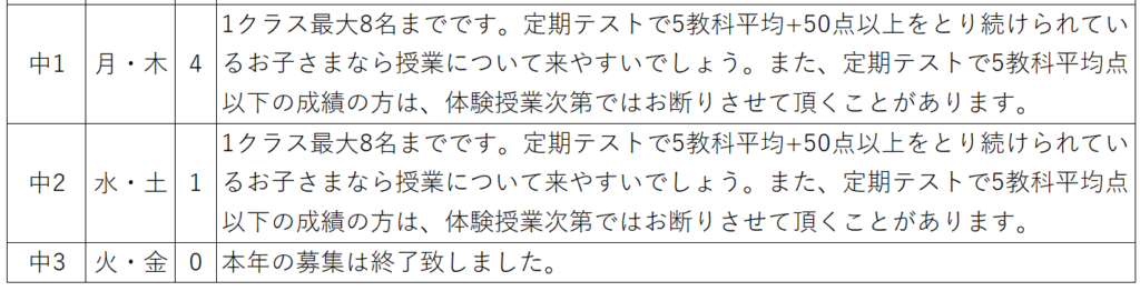 ただし、早期入塾者(現中3生の多くの方、現中2生2名と中1生1名)は対象外とさせて頂きます。