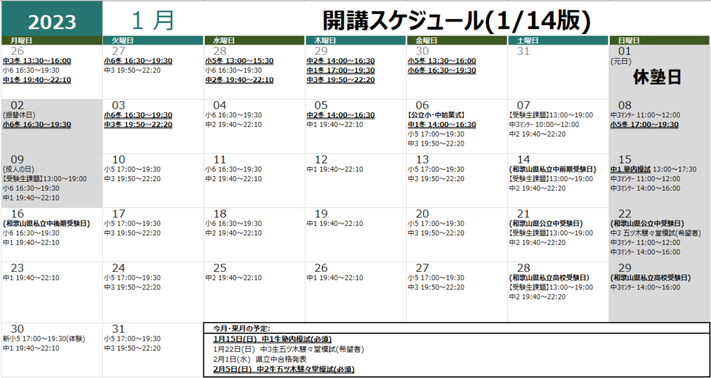 休塾日は、今後もホームページと共に、塾生にはカレンダーにてお知らせして参ります。