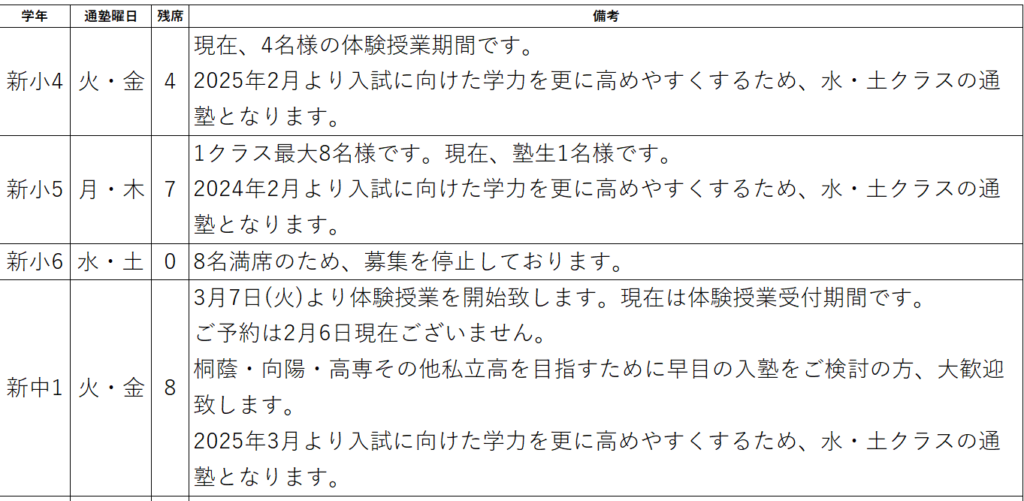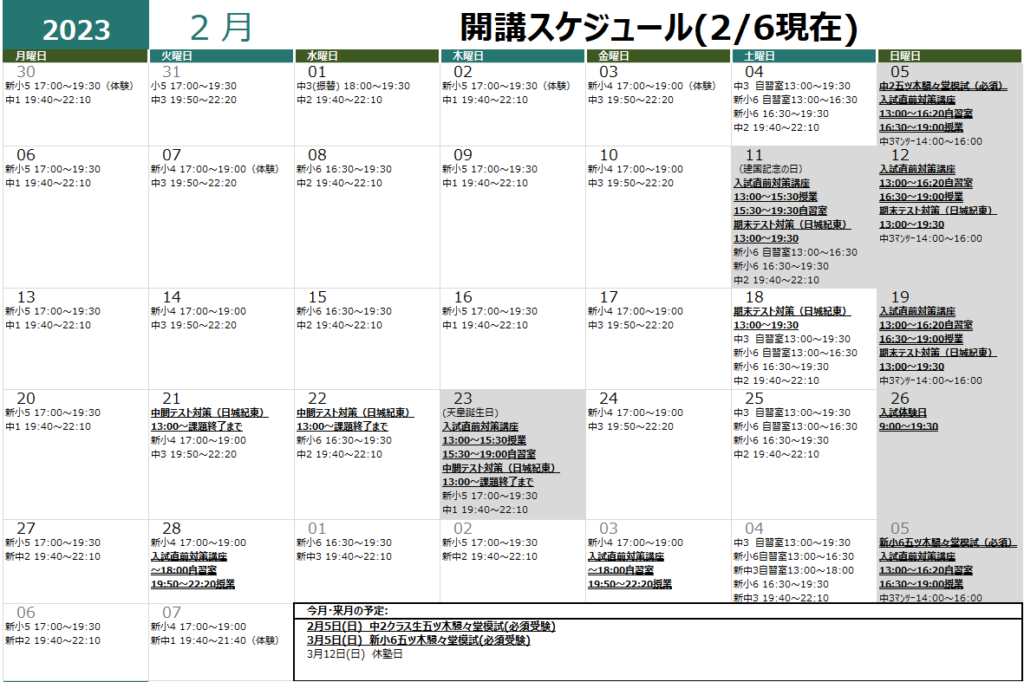 3月12日(日)、4月30日(日)を休塾日と致します。次の休塾日は未定ですが、5月、6月も1回ずつくらい取れればいいなあとは思います。また、新小6、新中2、新中3は春期講習を予定しております。日程は決定次第お知らせ致しますので、宜しくお願い致します。