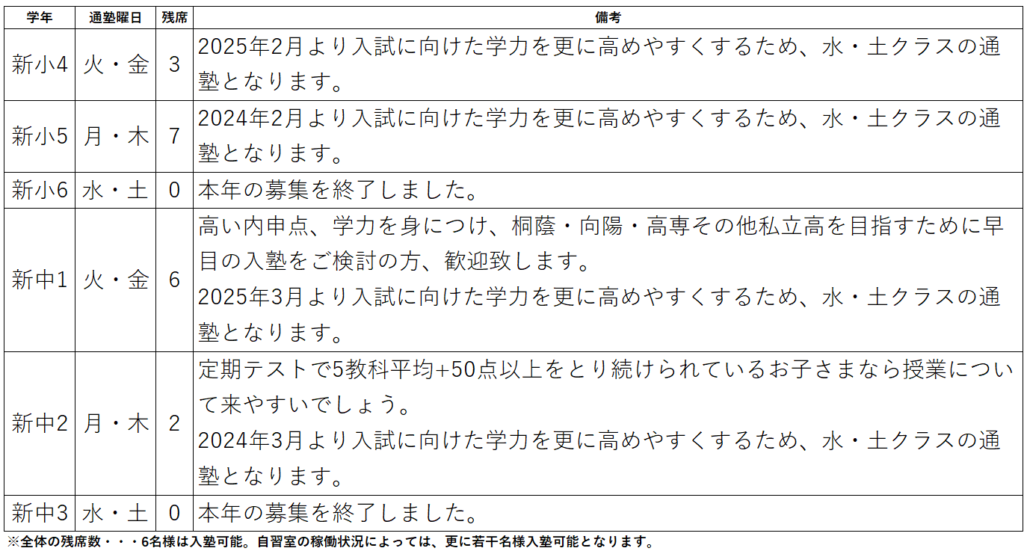 各学年の定員は、小6・中3を除き余裕がありますが、あと約6~9名様くらいで、自習室のキャパオーバーとなってしまいますので、様子を見ながら、その時点での全学年満席扱いとさせて頂くことがあります。