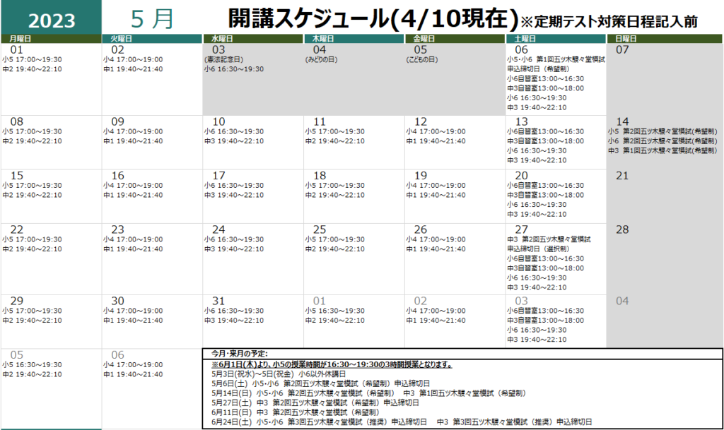 また、中1生と中2生は8月27日(日)の塾内模試と、9月10日(日)の五ツ木駸々堂模試のいずれかを必ず受験下さい。