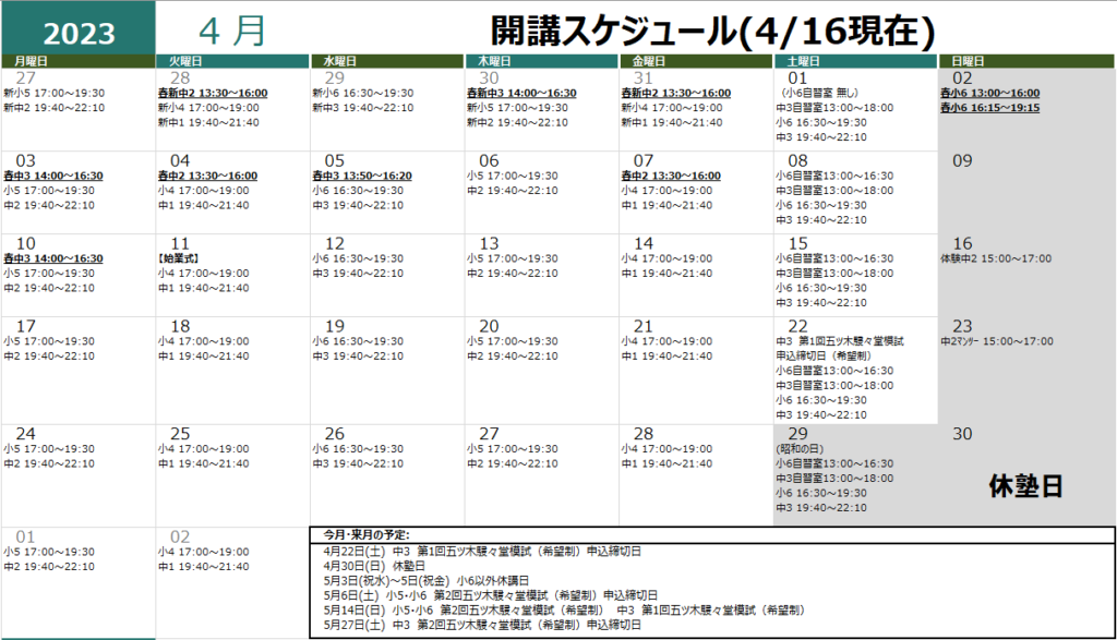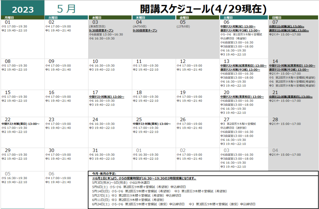 五ツ木駸々堂模試の申込受付締切日入りのカレンダーと致しましたので、改めてアップします。