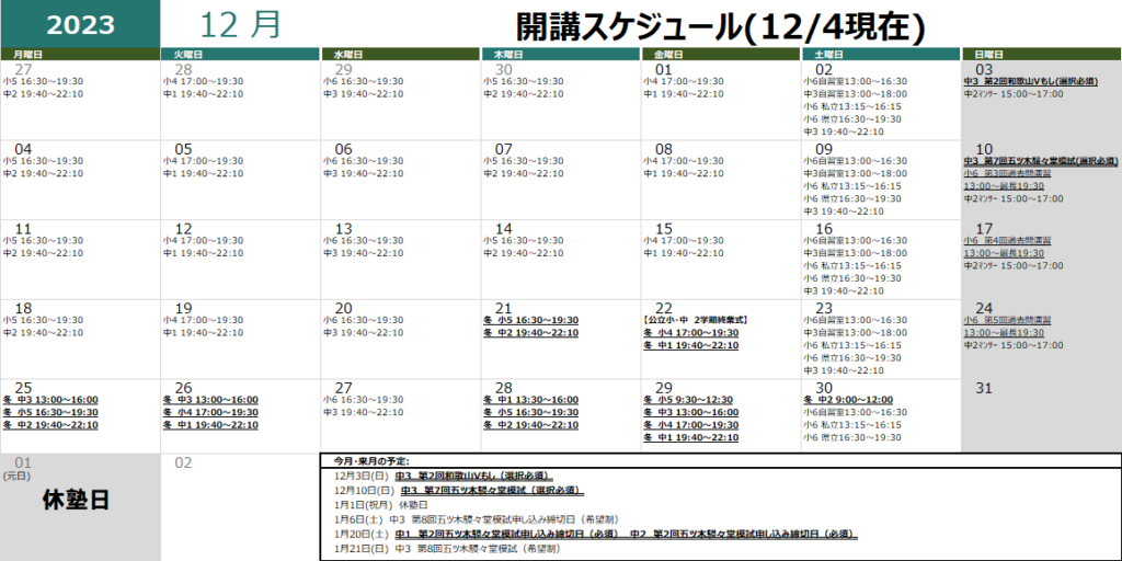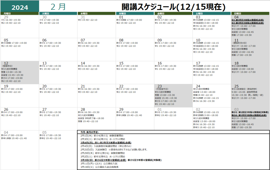 2月3日(土) 新小6(現小5) 水・土授業および土曜日課題自習開始日
