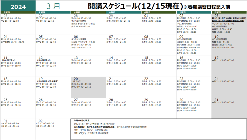 3月2日(土) 新中3(現中2) 水・土授業および土曜日課題自習開始日