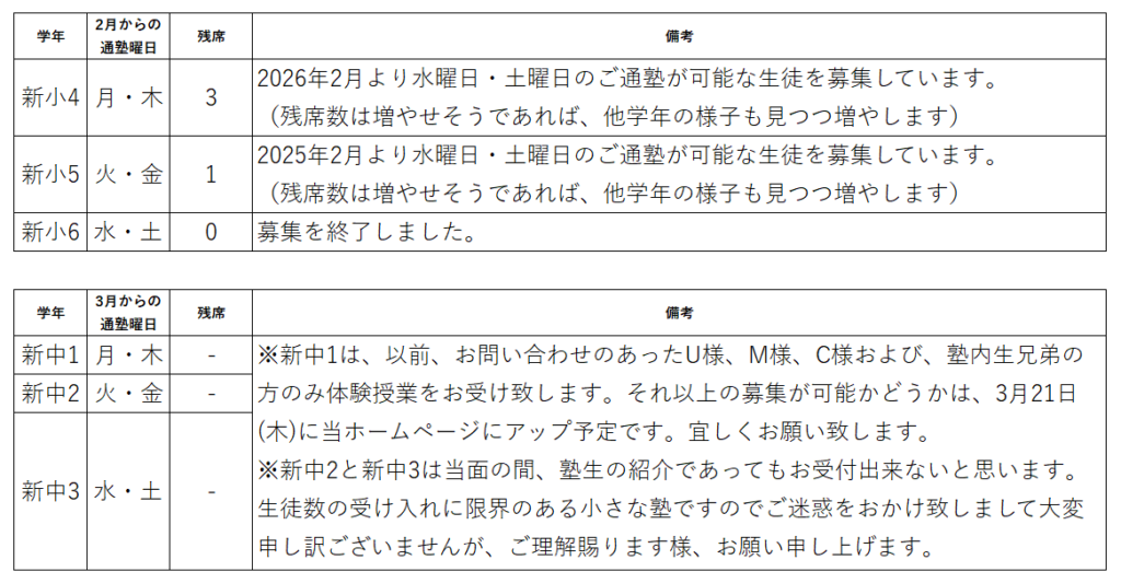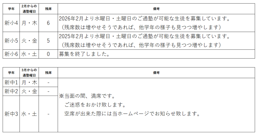 残席2席ですので、体験済の方、これから体験授業の方のご入塾が決まれば満席となります。