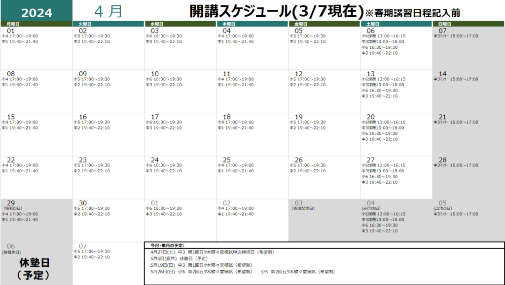 ★5月6日(振月)は休塾日の予定です。来月お出しするカレンダーで決定と致しますが、各中学校の中間テスト日程によっては開ける可能性もあります。