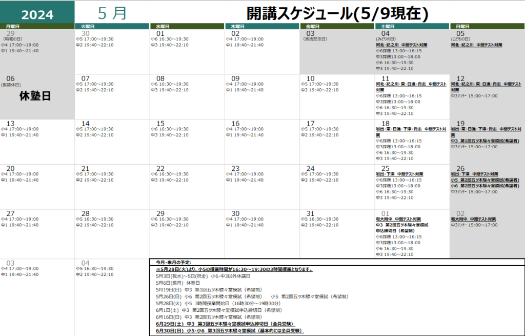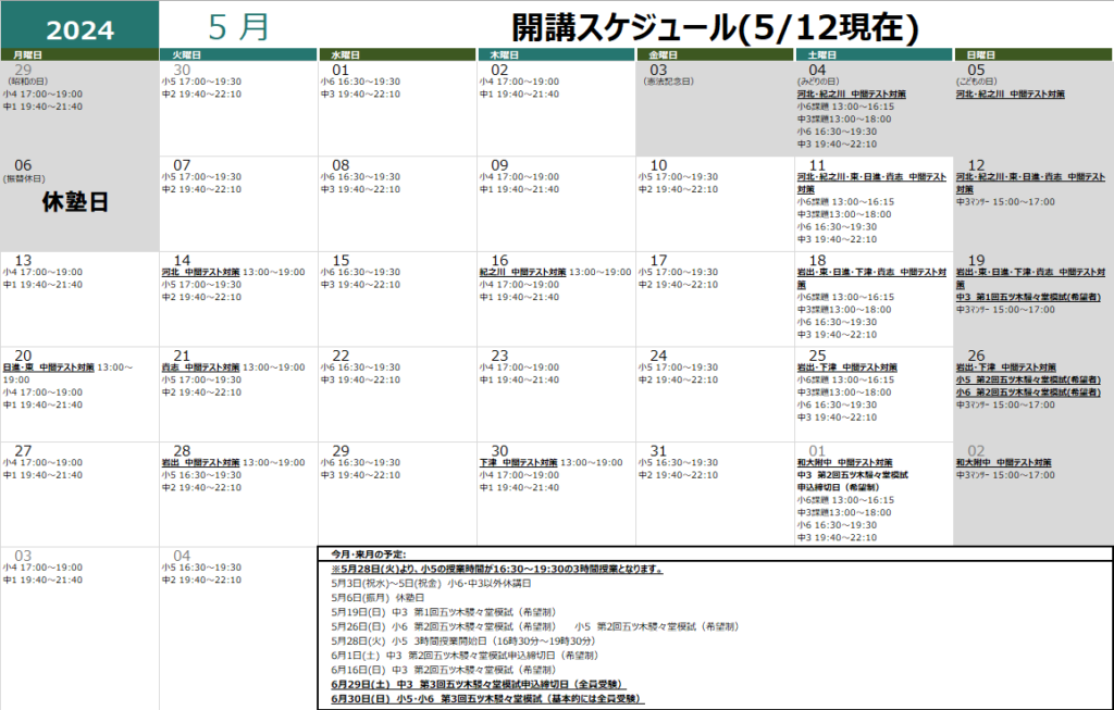 ★7月の当塾連休は、現在のところ、7月5日(金)~8日(月)の4連休を予定しております。決定次第カレンダーにてお知らせ致します。