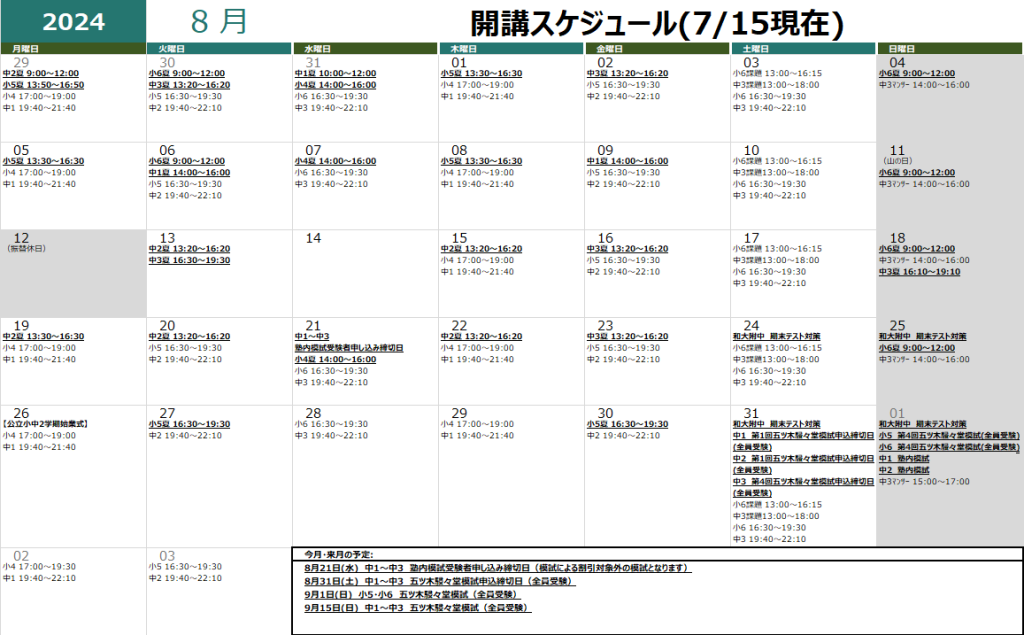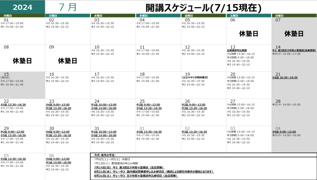 夏期講習日程を以上のように決定致しました。宜しくお願い致します。