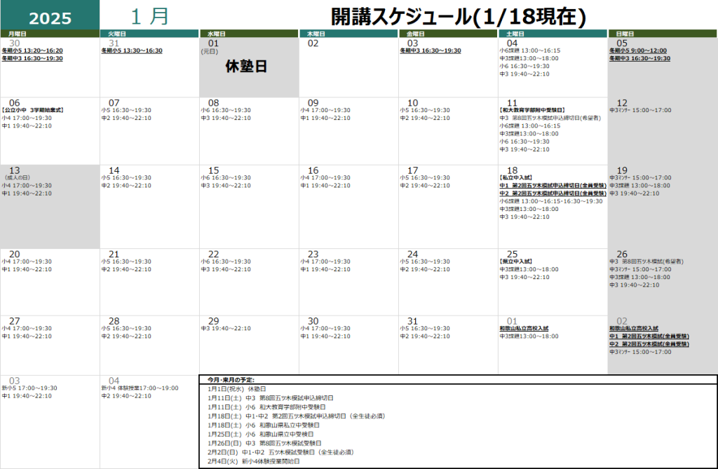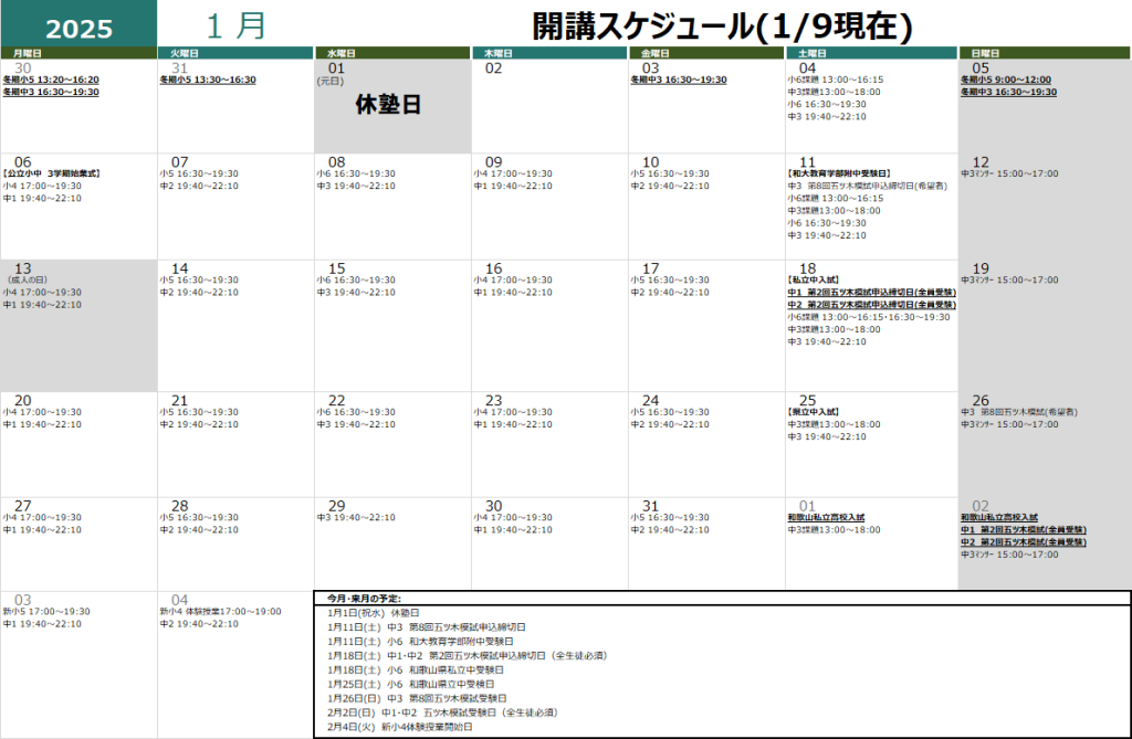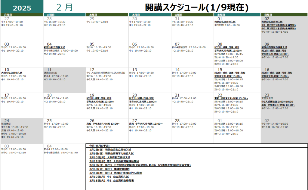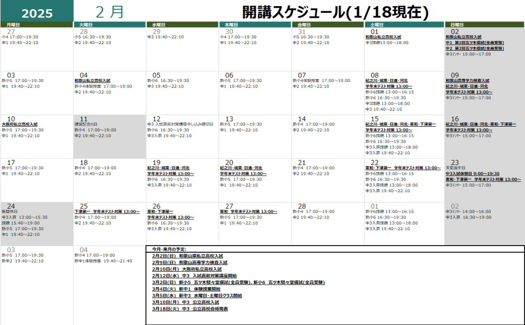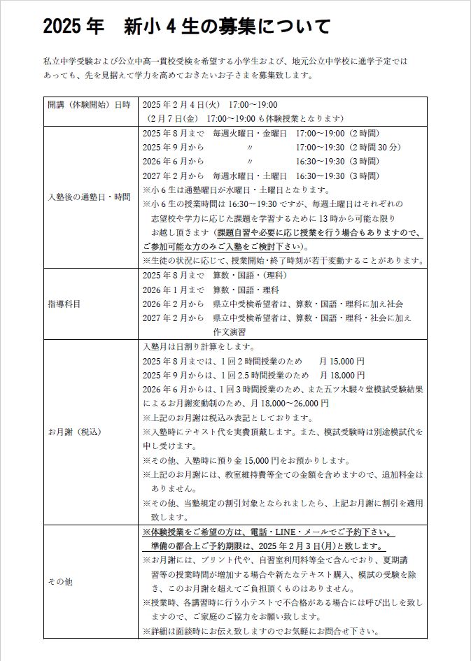 新小4(現小3)体験授業開始日は2月4日(火)、新中1(現小6)体験授業開始日は3月4日(火)となります。