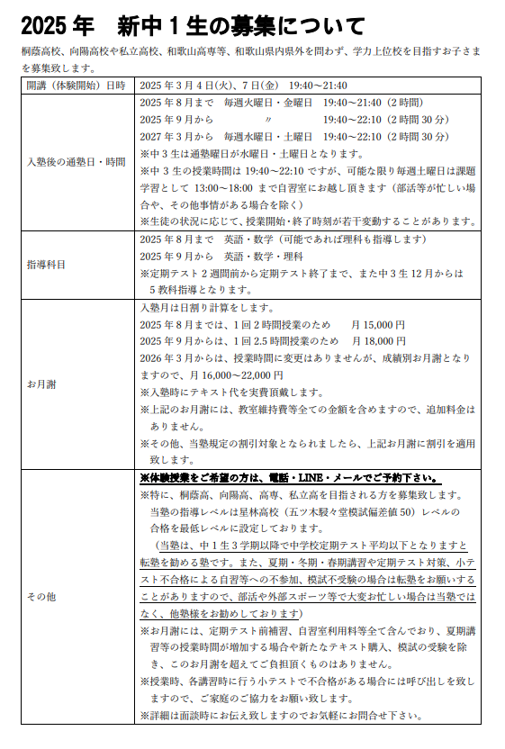 本日より、新中1生はどなた様でも体験授業の受付を開始致します。桐蔭高校、向陽高校合格に準ずる学力を目指すお子さまを募集致します。残席によりお断り申し上げないといけない場合もあるかもしれませんが、昨年はたまたま満席になっただけだと思います。とはいえ、ご希望の場合、出来る限りご迷惑をおかけしたくありませんので、お早目のお問い合わせを頂戴出来ますと幸いです。宜しくお願い致します。