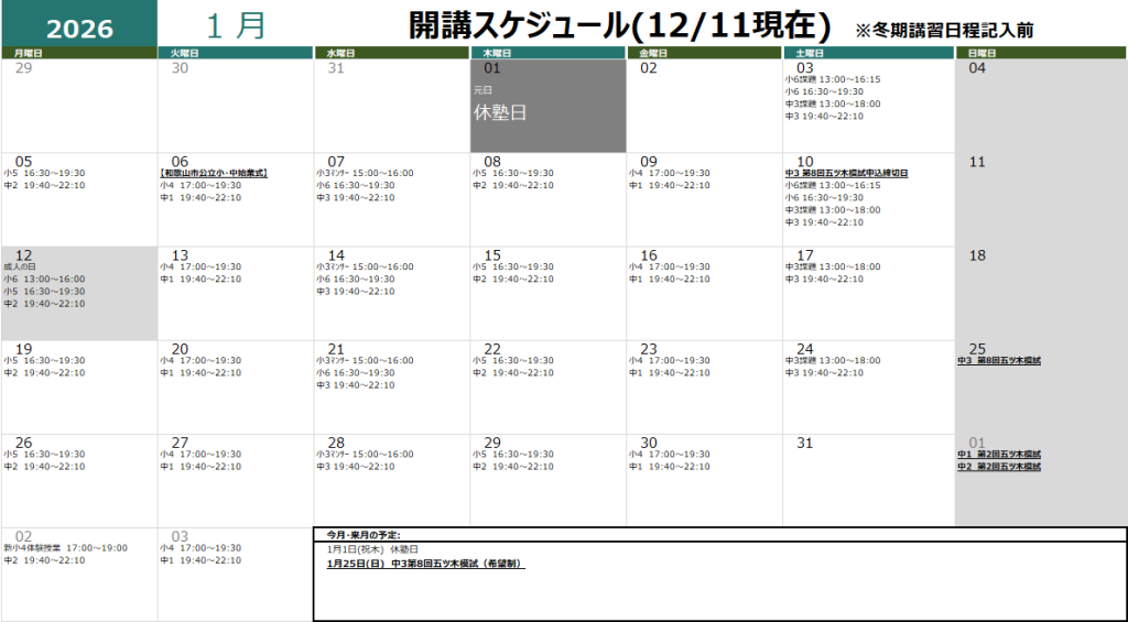※1月31日(土)、2月1日(日)は休塾日とする可能性があります。