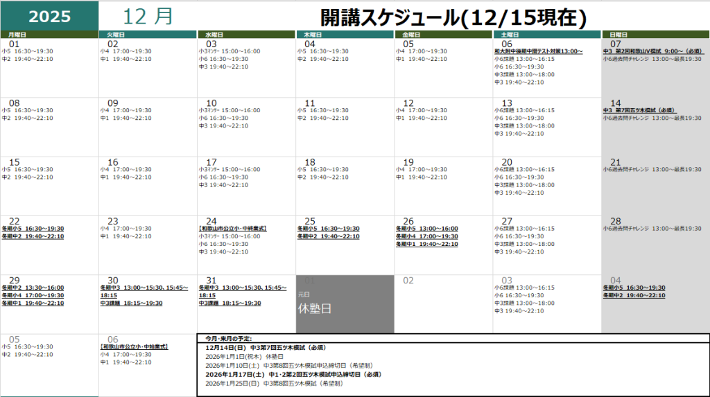 また、冬期講習込みのカレンダーを来週15日(月)より配布開始予定です。